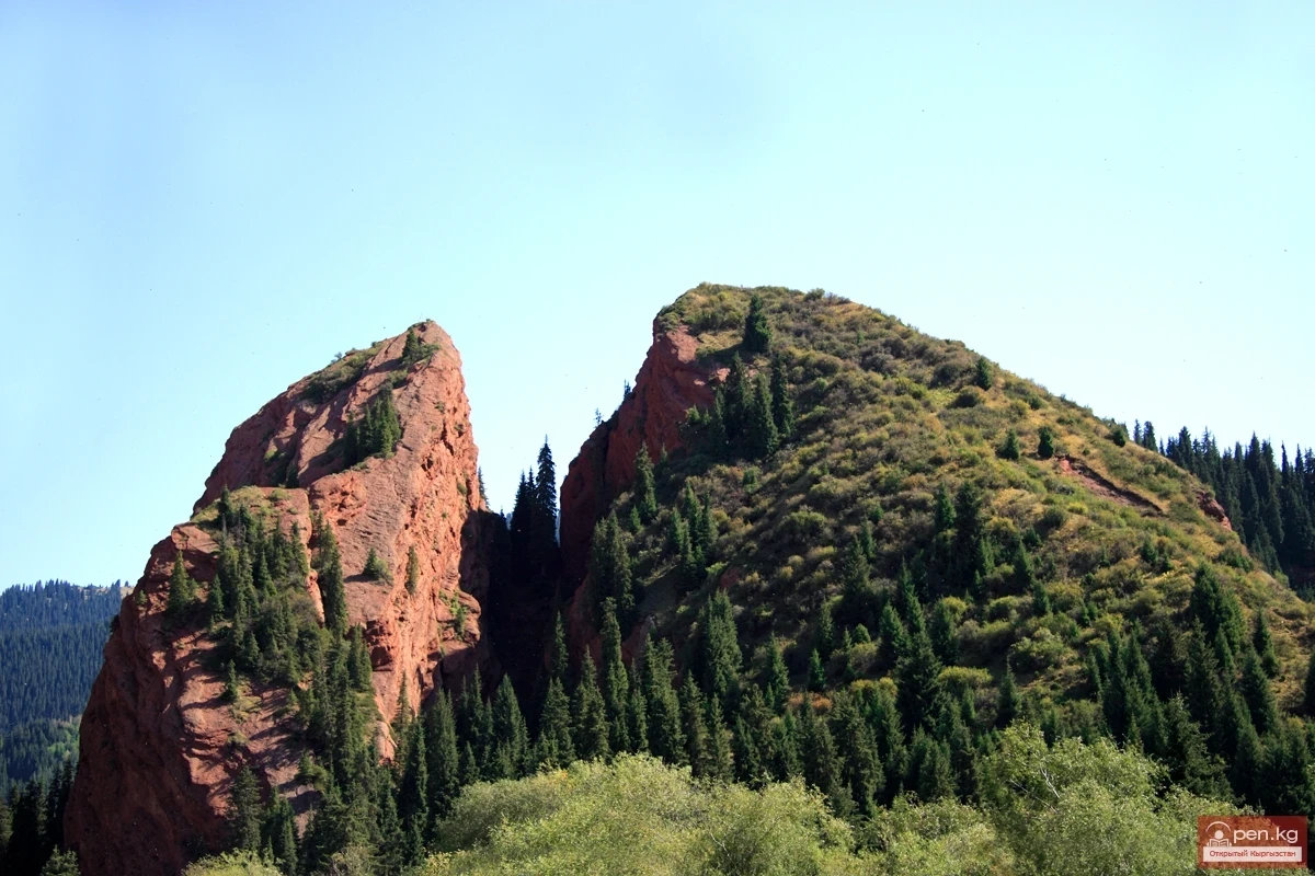 "Broken Heart" and "Seven Bulls," located in the low mountain ridge composed of Tertiary (Paleogene) red-colored deposits, and thirdly, this is an ancient settlement where the residence of the Usun ruler was located. The Jety-Oguz gorge is located 30 km west of the city of Karakol, and its length is 37 km. Huge dark green masses of spruce forest on the slopes of red sandstone create a beautiful contrasting impression. Behind the narrow passage, where the Jety-Oguz canyon begins, lies the beautiful place Kok-Dzhaiyk, which is very popular among tourists. Increased interest from tourists has been noted by local tour operators, who annually organize a yurt tourist camp here, offering a variety of services, including horseback excursions into the high-altitude zone and neighboring mountain valleys. In the upper reaches of the rivers, there are lakes, waterfalls, a zoological reserve, and interesting gorges-canyons. The upper part of the valley is closed by a multi-meter wall, in the middle of which rises the beautiful double peak Oguz Bashi (Bull's Head), 5170 m high. This peak is often compared to the beauty of the Swiss Alps - the Jungfrau mountain.