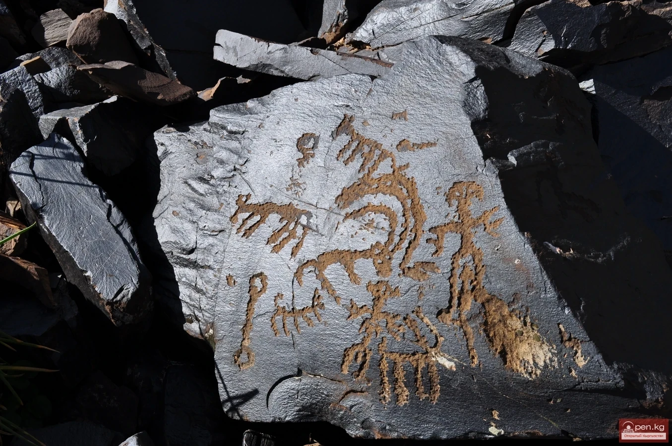 In the rock paintings of Saymaluu-Tash, there is no background. The figures of animals and people are freely placed on the surface of the stone. Depending on the angle of sunlight, they either blaze brightly, sharply contrasting with the color of the stone's surface, or completely blend in with it.