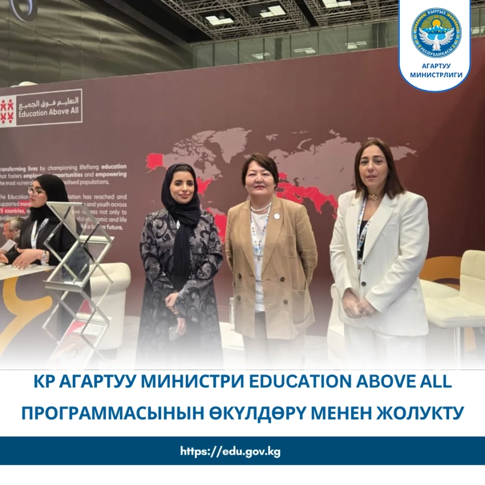 At the Second World Summit on Social Development, taking place in Doha (Qatar), the Minister of Education of Kyrgyzstan, Dogdurkul Kendirbaeva, and the Deputy Minister of Digital Development, Lira Samykbaeva, held a meeting with representatives of the international educational initiative Education Above All (EAA). During the discussion, the parties explored opportunities for joint implementation of educational projects in Kyrgyzstan with the support of EAA.