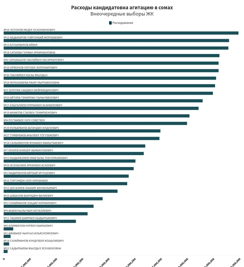 This amount includes payment for the work of the headquarters, campaigners, as well as expenses for printing and producing campaign materials. Each candidate is required to provide weekly reports on their expenses and revenues, not exceeding the established limit.A study conducted by Kaktus.media revealed both the most generous candidates and those who spent the least on campaigning. Note that some candidates listed expenses for registration with the Central Election Commission amounting to 300,000 soms as a separate bank payment. Additionally, some had refundable payments, but they did not significantly affect the overall picture.