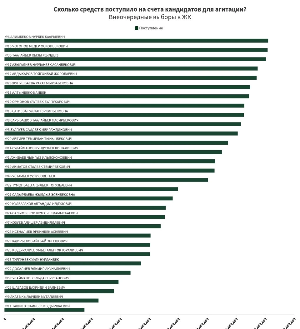 Based on the collected data, Kaktus.media compiled a ranking of candidates from various districts who received the maximum funds for their campaigning activities.The top three leaders included Nurbek Alimbekov, Meder Chotonov, and Zhyldyz Talaybek kyzy, who had more than 18 million soms recorded in their accounts. However, actual expenses turned out to be significantly lower, which changed the order of the leaders. The final list included Meder Chotonov, Toygonbay Abdykadyrov, and Aibek Altynbekov.