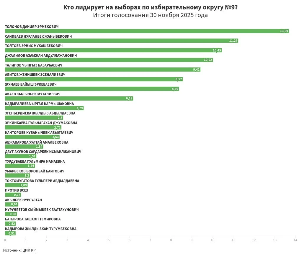 Preliminary results show that in district No. 9, the following candidates with the highest number of votes are entering the Jogorku Kenesh: