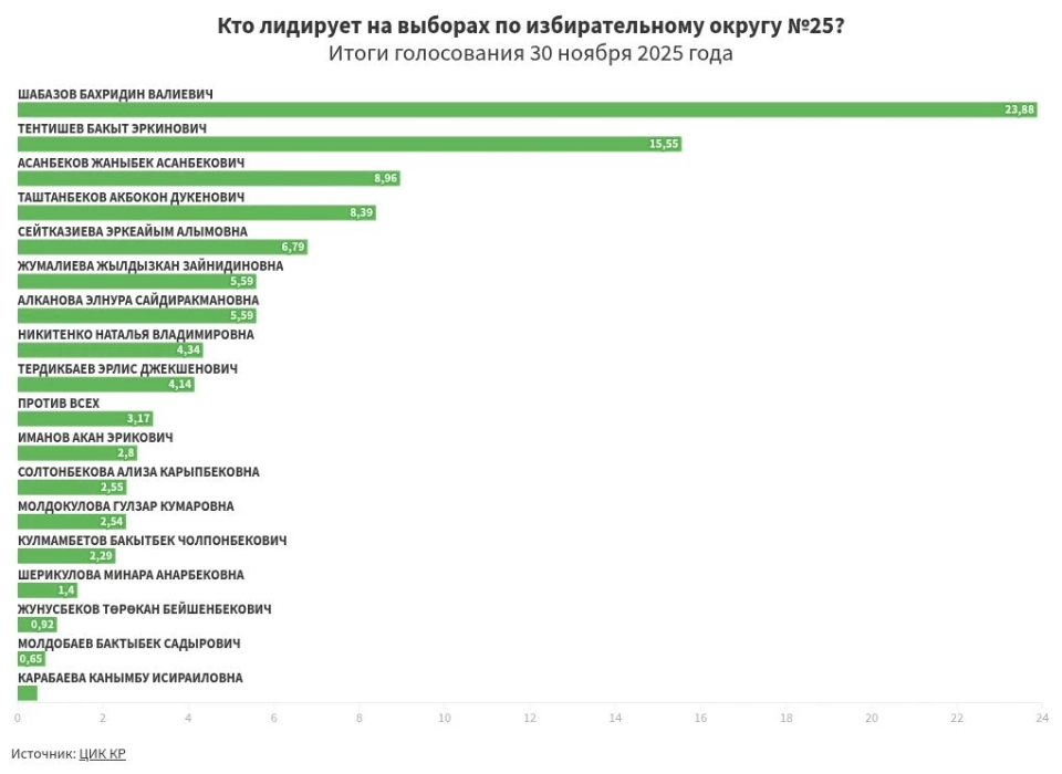 According to preliminary data, the following candidates, who received the maximum number of votes, are advancing to the Jogorku Kenesh from district No. 25: