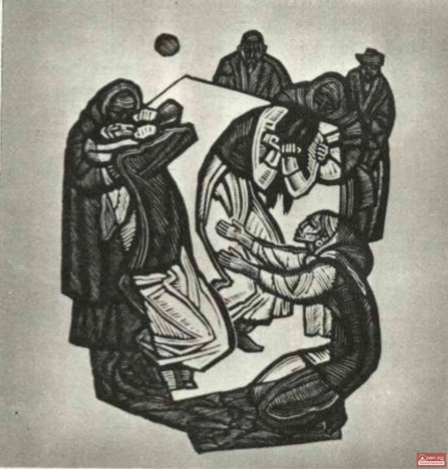 Бул жерде анын жетилген устаттыгына — сүрөт тартуу, композиция, графикалык материалдын экспрессивдүү мүмкүнчүлүктөрүн эске алуу менен, образдуу концепцияны билдирүү үчүн ийкемдүү жана так колдонулушу көрүнүп турат.