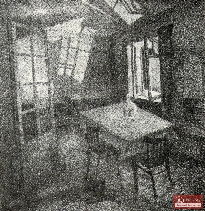 Владимир Григорьевич Рогачевдун чыгармачылык ийгилиги — Ч. Айтматовдун «Эне талаасы» повестинин мотивдери боюнча автолитографиялар сериясы (1966—1967). «Балалык», «Умтулуу», «Көңүл» («Жамгыр») сериясындагы листтерде айтматовдук каарман аялдардын терең мүнөздөрү, адамдын тагдырынын драматизми, согуш жылдарындагы жашоонун кыска атмосферасы сезилет. «Көңүл» («Жамгыр») композициясы өзгөчө таасирдүү, анда сүрөтчү жаратылыштын күчүнүн адамга болгон оң таасирин, «дарылоо» эффектин өткөрүп берүүгө жетишкен. Көңүл, жашоо, тазалануулар — бул ассоциацияларды жамгырдын алдында турган жаш кыргыз кызын сүрөттөө жаратат, ал жамгырдын агымына жүзүн жана колдорун буруп, жан дүйнөсүндө топтолгон кайгыны алып кетип жаткандай. Бул жерде фигуранын реалистикалык сүрөттөлүшүнүн масштабын жана шарттуу фонго карата кесилишин так аныктоо, лаконикалык жана таасирдүү тондук чечим бар. Кагазга жумшак, татаал таш текстурасы тыгыз жайгаштырылган. Кара, ак, сары түстөрдүн градациялары жука эске алынган. Рогачев бул жерде Ч. Айтматовдун образдарын визуалдык искусстводо терең ойлонгон интерпретатору катары, ошондой эле графикалык материалдын өзгөчөлүгүн сезген, өз алдынча ойлонгон сүрөтчү катары чыгат.