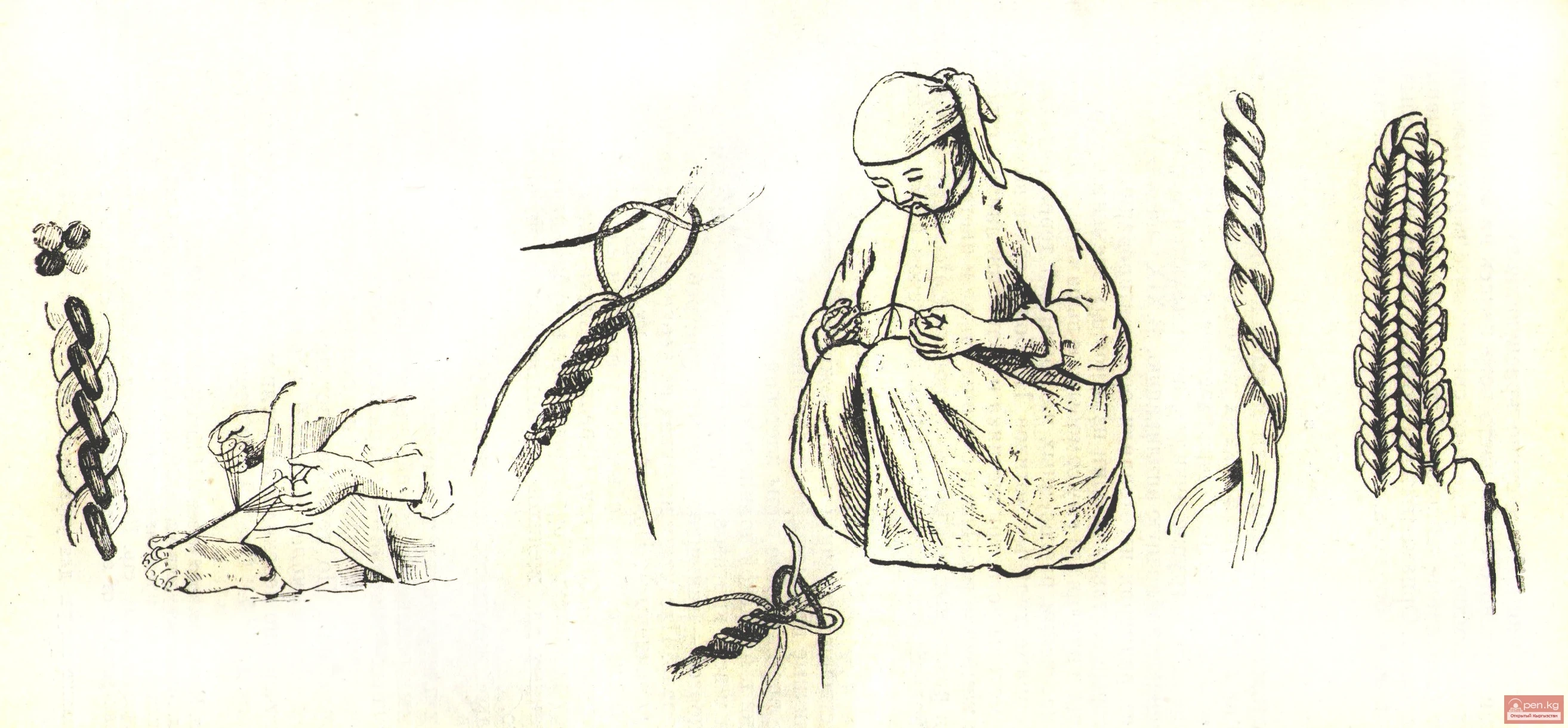 Токуу жана жиптерди токуу ыкмаларынын ортосунда орнаменттүү жип (чырмама) жасоонун өзгөчө ыкмасы бар, анын туурасы 5—7 см, ал жиптерди бекемдөө жана буюмдарды байлоо үчүн колдонулат. Тугун жиптерди катуу жиптерден тартуу менен тартат, алардын саны дайыма жуп болот. Уток катары ар кандай түстөгү жиптер (адатта кызыл, көк, роза, ак, күрөң түстөр) колдонулат. Алар негизги жиптерди бирдей фронт жана арт жагынан айкалыштырат. Натижада геометриялык баскычтуу-шахмат үлгүсү пайда болот.