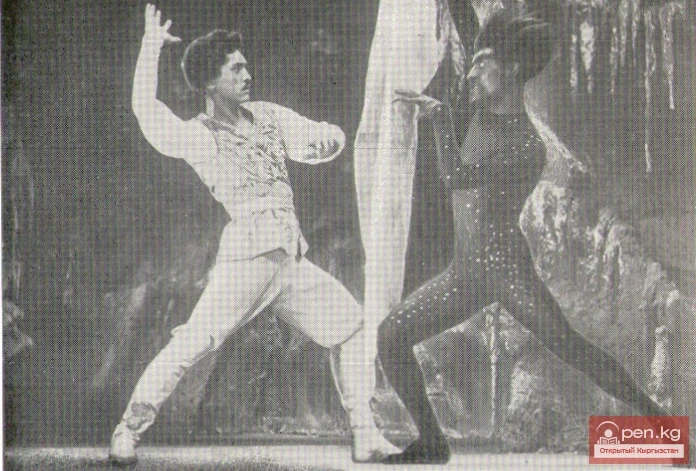 Бир аз кийин ушул партияда артист Б. Алимбаев чыгып, анын чеберчилиги туруктуу өсүп жатат. Бийчи катары ал узундук жана пластикага, кыймылдуу жана ийкемдүүлүккө ээ. Экинчи пландын партияларынан баштап, ал башкы ролдорду аткарууга өттү.