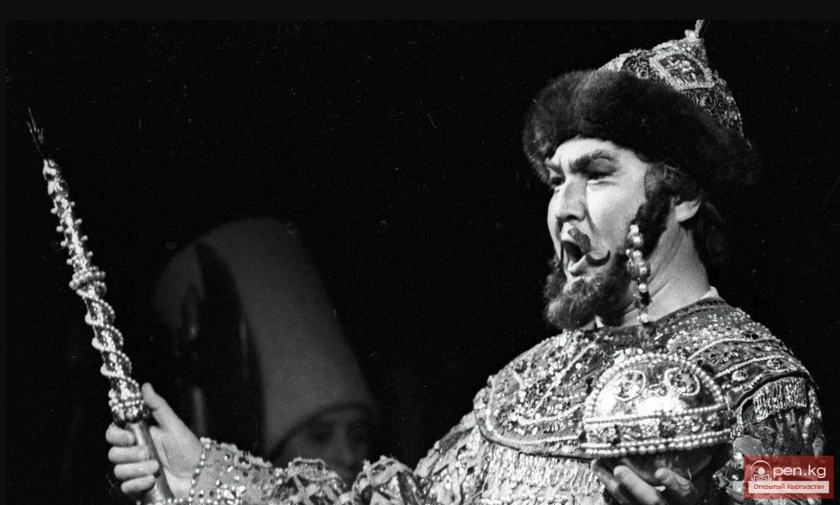 ...«Куранттар менен сцена» «Борис Годуновдон»... Минжилкиев — өз Борисинде. Кысым, драма, толук ички бөлүнүү — өтө ишенимдүү, руханий берилиштин образы. Мен Минжилкиев-Годуновду телеэкранда биринчи жолу көрүп жатам. Жакын план... Азаптанган жүз, көздөр... Жана кенет... Кенет ойлоп калам — бул театр, инсценировка! Эң жакшы учурда — телеконцертте өлдү. Амфитеатрдан бинокль — мында сизге Борисдин жакын планы. Режиссердун командасы теле студиясынын павильонунда концертти өткөрүү учурунда — мында сизге дагы бир жакын план. Бирок биз фильмди көрүп жатабызбы? Телевизиондук! Демек, традициялык кинематографикалык монтаждан тышкары, анда сөзсүз түрдө, жашашы керек, деталь болушу керек. Маанилүү, таасирдүү детальдын визуалдык образы, ал сөзсүз түрдө болгон нерсени баса белгилеп, аны көрүнүктүү кылат, ошол эле учурда бизди болуп жаткан окуянын катышуучулары кылат. Кошулуш, сезимдер, жана жөн гана байкоо эмес... Чыныгы телевизиондук спектаклдин уникалдуу мүмкүнчүлүгү. Даже бул учурда, албетте, Мюнхендин «Олимп-халле» дүйнөлүк фигуристтер чемпионатында эмес, XVI кылымдагы Руси, Борис Федорович Годуновдун палаталарында. Бирок бул күтүүсүз катышуу эффектин жаратууга мүмкүнчүлүк бериши мүмкүн эле! Кайгырып жаткан Борис, падышанын палаталары — жана биз, дээрлик жанаша... Фантастикабы? Телевидениенин спецификасы! Ал эми режиссерге (жөн гана) көзөмөлдөн чыгарууга болбойт... эпизодду түзгөн декорация элементтери — театрдык спектаклдин декорациялары, ошол учурда белгилүү художник А. В. Арефьев тарабынан жасалган.