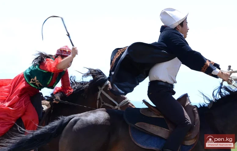 «Жоолук таштамай» («Жоолук ыргытуу»), «Думпульдек» («Барыштар жана койлор оюну»), «Жашынмак» («Жашыруун оюну»), «Кыз куумай» («Кызды кууп жет») сыяктуу элдик оюндар, «Ат-Чабыш» оюну, аркан тартуу — «Аркан тартыш», жигиттердин ат оюндары, эски найза менен күрөшүү — булар бий композицияларынын негизин түзгөн.