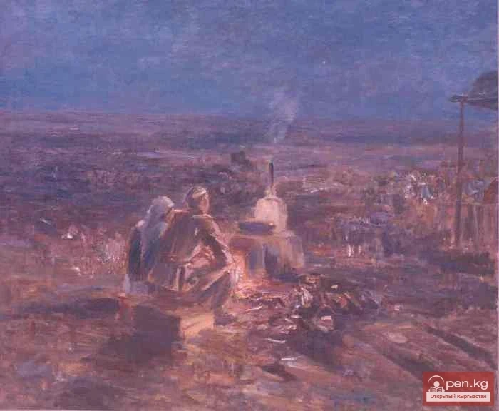 «Беркут менен аңчылар» сүрөтүндө күңгүрт-ысык, 심지어 душный түстүн биринчи көз карашта мейкиндикке көз караштын кыймылын тосот, анда адам фигураларынын контурлары так көрүнбөйт. Бирок, түстүн гаммасы жана живопис структурасынын каршылыгын жеңип, биз өзүнчө жаратылыштын кең мейкиндиктерине кирип, жөнөкөй адамдардын жөнөкөй чертеждерине жана алардын жашоосунун чындыгын сезүүгө аракет кылабыз.