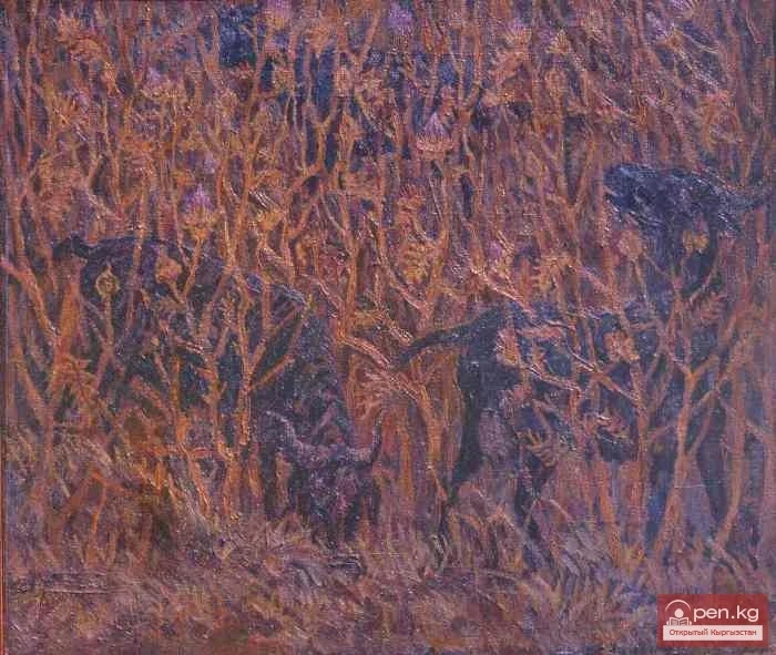 Бул эмгектерде формалдык курулуштардын тапшырмасы ар дайым көркөм образды ачууга баш ийет. Мисалы, анын «Козулар бурьянда» (1971) сүрөтүн алсак, анда, сүрөттөлгөн беттин ачык декоративдүүлүгүнө карабастан, татарник жана анын арасынан өтүп жаткан козуларды чагылдырган, мазмундуу даны декоративдүүлүк эмес, сүрөттөлгөн предметтердин жандуу абалы жана адам тарабынан анын сезилиши. Сүрөтчү живопистик тилдин шарттуулугун реалдуу образды жана реалдуу сезимдерди берүү үчүн чеберчилик менен колдонгон.