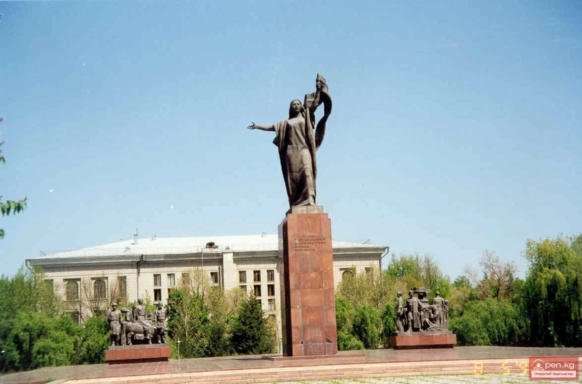 Эстелик ансамблинин идеалдык-композициялык борбору — жогорку көтөрүлгөн гранит пьедесталдагы кыргыз аялдын фигурасы, эркиндик туусун бийик көтөрүп турат. Борбордук монумент үчүн аял фигурасын тандоонун өзү терең логикалуу, анткени кылымдар бою эзилген чыгыш аялдарынын тагдыры XX кылымдагы чоң социалдык өзгөрүүлөргө өзгөчө таасир эткен.