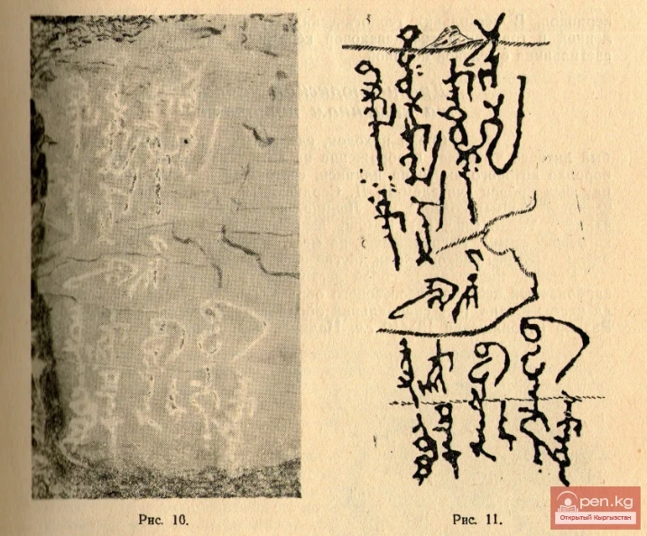 Жазыктын орто бөлүгүндө, Суулуу-Бакайыр дарыясынан 2,5 км алыстыкта, түштүк-чыгышка караган төмөнкү тоо тектеринде, узундугу 14 см, бийиктиги 3 смге жакын болгон кыска (алты графемадан турган) эрте түрк руналык жазуусу чегилген. Алгачкы текшерүүдө, бул жакшы сакталган жазуу гана көрүнүп, ошондой эле башы гриб формасындагы эки адамдын фигурасы, алардын бири бүтпөй калган. Бирок, тоонун бетин мохтон жана минералдык катмарлардан кылдат тазалагандан кийин, бүтүндөй «сүрөт галереясы» ачылды (рис. 5, 6).