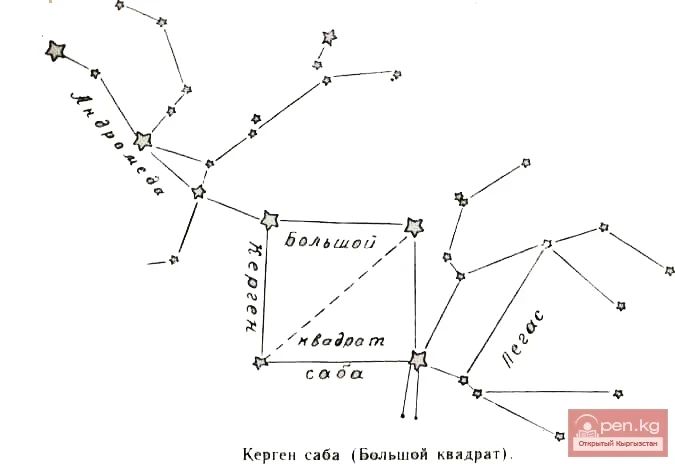 Эки жулдуздар тобуна — Пегас жулдуздар тобу жана Андромеда жулдуздар тобуна таандык болгон чоң квадратты кыргыздар Керген саба (букв. тартылган териден жасалган бурдюк, анда кумыс даярдашат) деп аташкан. Алардын байкоолоруна ылайык, бул төрт жылдыз — жазында көрүнбөйт, күзүндө зенитте көрүнөт, ал эми кышында асманга батыш тарапта пайда болот.