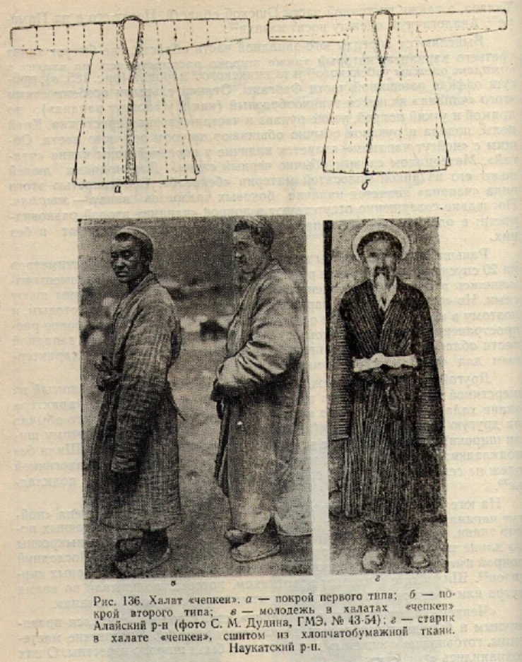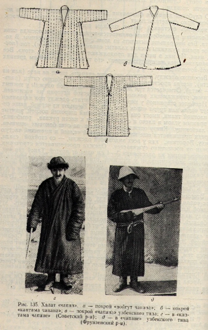 Түштүк Кыргызстанда бул кийимдин эки формасы белгиленет: 1) «нойгут чапан» түрүндө (рис. 135, а), мында колтуклар кездеменин көлөмдүү тилкелеринен тигилет, жана 2) «чепкен» алдыңкы полдо клинсиз, колтуктары кездеменин узундугуна жараша кийгизилет жана бир аз тегерек колтук менен (рис. 135, б).