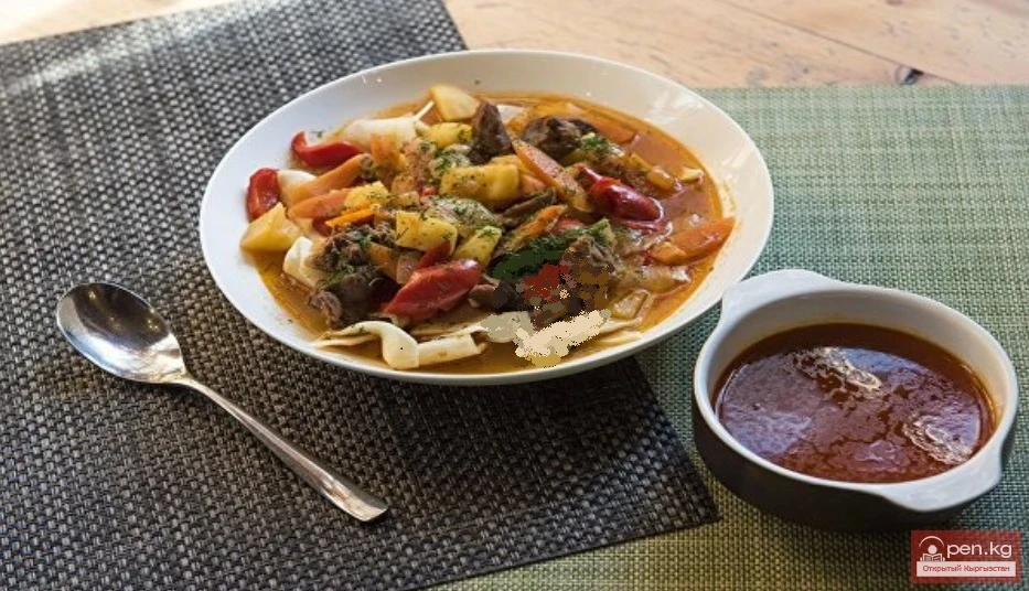Этке жашылчаларды кошуп, андан кийин томат пастасын кошобуз. Баарын аралаштырып, 3-5 мүнөт кууруйбуз. Андан кийин ингредиенттерди суу же бульон менен куюп, кайнаганча жеткирип, картошканы салып, жай отто 40-50 мүнөт бышырабыз. Бышып бүтө электе 5-10 мүнөт мурда даамына жараша татымалдарды жана каалаган болсоңуз, кесилген помидорду кошобуз.