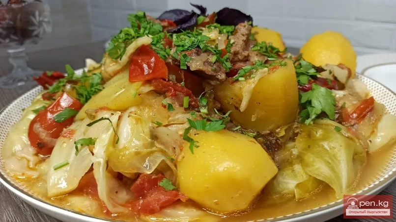 Сууну же бульонду кошууга кереги жок. Жашылчалар суюктукту берет. Жогорку катмарлар буу менен бышып, төмөнкү катмарлар өз суюктугуна бышып кетет.