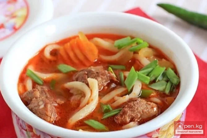 Бышыруунун акыркы 15 мүнөтүндө супка лапшаны салып, калдыктан сарымсак жана джусай менен себелеп коёбуз.