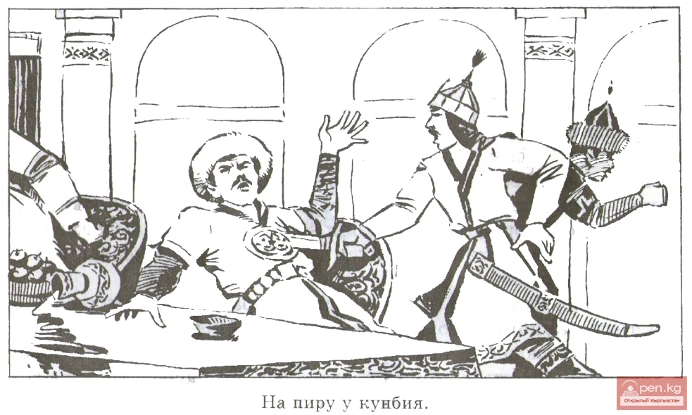 — Зат! — деп кыйкырды башкаруучу, жана бычак менен экинчи соккуну кайтарды. Эмне болуп кетти! Бражниктер дароо мас болбой калышты. Баары туруп кетти, кимдир бирөө кой этинен жасалган табакка тайып, пиршеүү жабуусуна жатып калды, кимдир бирөө четке кетип, сыртка чыгууга аракет кылды. Бирок көпчүлүгү бири-бири менен кармашып кетти: бул жерде башкаруучунун тарапташтары жана анын жашыруун душмандары бар эле.