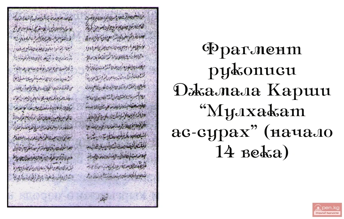 ЖАМАЛ КАРШИ, Абу-л-Фадл ибн Мухаммед Джамал ад-Дин Карши (1230-1231-жылы туулган, өлгөн күнү белгисиз) Семиречье аймагындагы тарыхчы, тилчи жана акын болуп саналат. Ал Алмалык шаарында, Эл-Аларгу вилайетинин борборунда туулган. Анын атасы Баласагун шаарындагы окумуштуулардын бири болгон. Уулун тарбиялап, билим берүү үчүн Сугнак-тегини Джамал ад-Динге «Карши» («Палата») деген ысым беришкен.