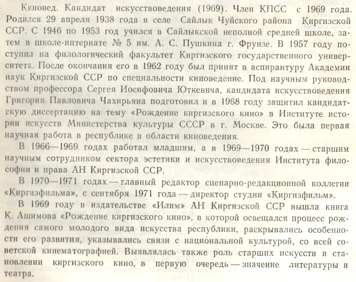 Республикадагы кино өнүгүүсүнүн кыскача очерки «Экран Киргизии рассказывает» 1976-жылы Москвада совет кино искусствосун пропагандалоо бюросу тарабынан жарык көрдү.