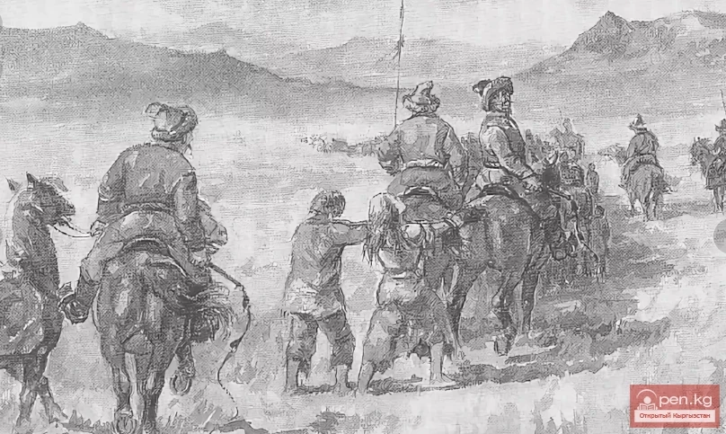 Куралчан кыргыздар караван өткөөлгө киргенде дароо пайда болушту. Алгач алар алыстан айланып жүрүштү, жакын келүүгө коркпой, андан кийин бош өткөөл үчүн выкуп тууралуу сүйлөшүүгө киришти. Алар өздөрүн скромно алып жүрүшүп, коркутушкан жок, каравандан болгону сегиз кызыл терини алышты. Тажрыйбалуу Мусабай таң калып, таң калып, кыргыздардын коркоктугун түшүнө албай калды...