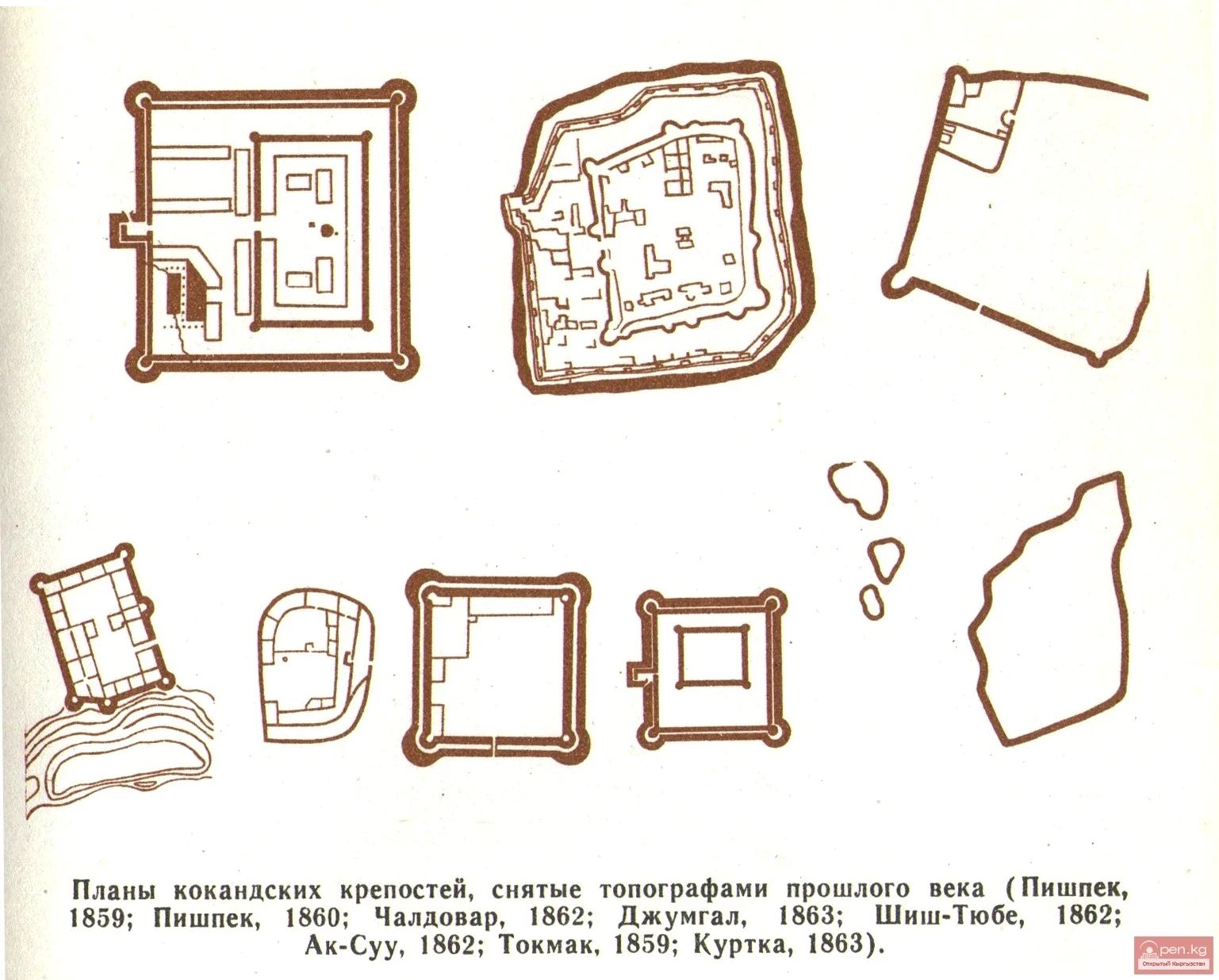 Пишпек бекетинин сүрөттөрү, схемалары жана сүрөттөлүштөрү сакталган — кыргыз жоочулары жана орус аскерлери тарабынан алынганга чейин жана андан кийин. Бекетти сүрөттөгөн замандаштардын бири, ал эки дубал менен курчалганын белгилеген. Ички дубал сырткы дубалдан бийик жана анча кенен болгондуктан, анын үстүнөн арба өтө алат деп айтылган.