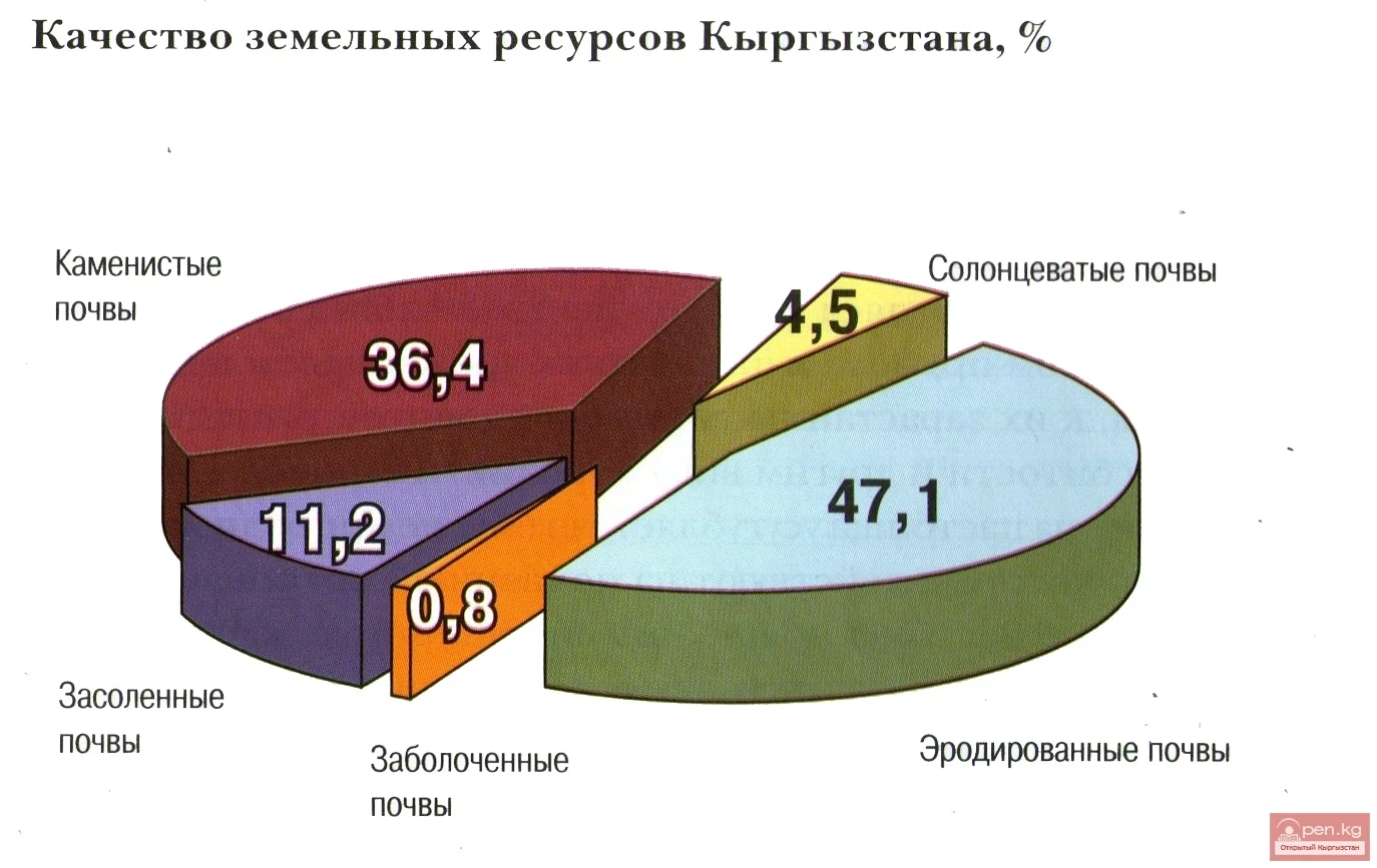Жерлердин интенсивдүү пайдаланууга тартылышы — айрыкча сугарылган жерлер үчүн, ошондой эле айрым социалдык-экономикалык факторлор көптөгөн терс көрүнүштөрдүн өнүгүшүнө алып келди. Айыл чарба жерлеринин чоң аянттары канааттандырарлык эмес абалда.