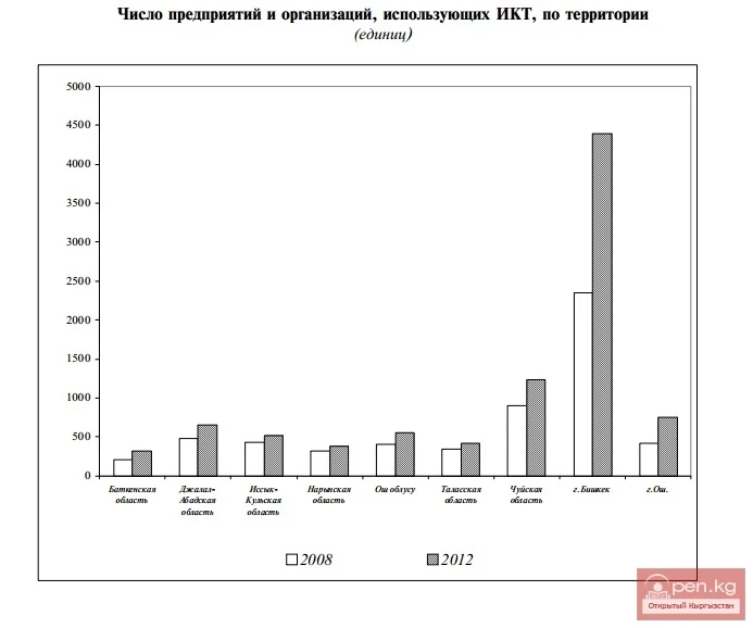 ИКТны колдонгон ишканалардын эң чоң үлүшү Бишкек шаарында (жалпы санынын 48 пайызга жакыны), эң аз үлүшү Баткен облусунда (3,5 пайыз) орун алган.