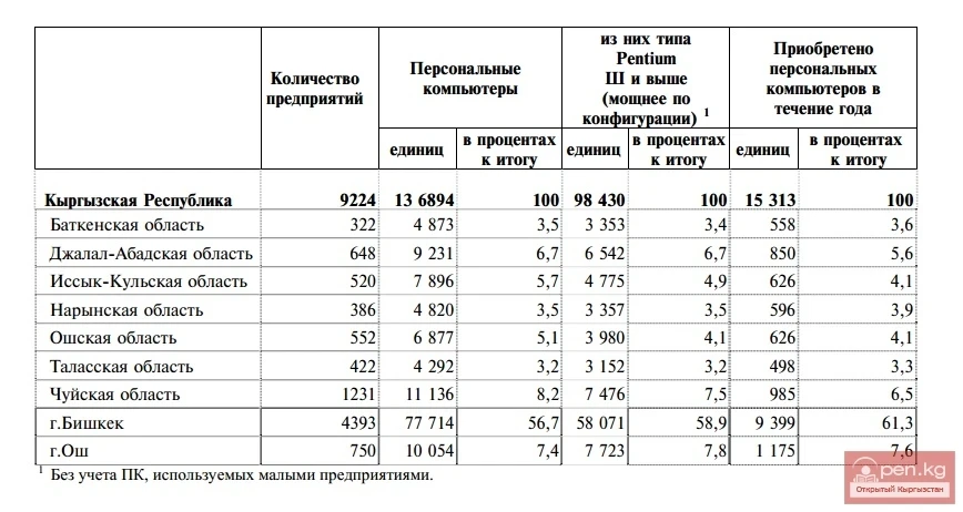 Ишканаларда жана уюмдарда (кичине ишканаларды эске албаганда) 2012-жылы Pentium III жана андан жогору конфигурациядагы компьютерлердин саны 71,9 пайызды түзгөн.