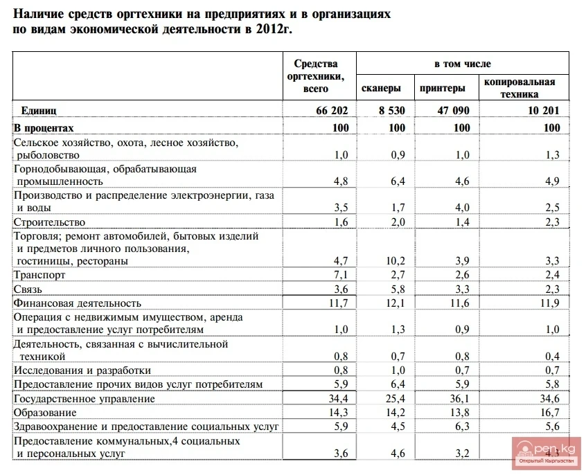 Жалпы оргтехниканын санынын ичинен принтерлер 70 пайыздан ашыгын, кагаз көчүрүүчү техникалар 15 пайызды, сканерлер 13 пайызды түзгөн. Республикадагы оргтехниканын жарымынан көбү Бишкек шаарында жайгашкан.