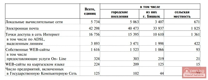 Бишкек шаарында орточо бир ишканага 8 электрондук почта жәшиги туура келет, Ош шаарында - 5, Ысык-Көл облусунда - үч жәшик.