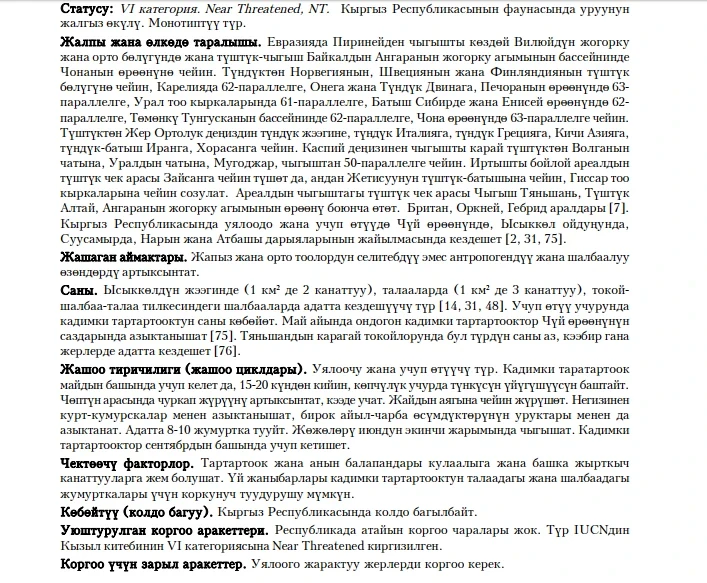 Статус: VI категория, Near Threatened, NT. Монотиптик түр. Чуй жана Суусамыр өрөөндөрүндө, Ысык-Көл аймагында, Нарын жана Атбаши дарыяларынын жээктеринде көчүп жүрөт жана жумуртка салат. Төмөнкү жана орто жерлерде айыл чарба жана шалбаа жашоочуларын артык көрөт. Ысык-Көл көлүнүн жээгиндеги чагылганда (квадрат километрге 2 жаныбар), талааларда (3), орман белдеминдеги шалбааларда көп кездешет. Көчүп жүргөндө куштун саны көбөйөт, май айында Чуй өрөөнүндөгү баткак жерлерде ондогон Кадимки тaртартоок азыктанат. Чыршыйларда сейрек кездешет. Май айынын башында келет жана токтоп, адатта түнкүсүн токтоп калат. Чөп арасында чуркаганды артык көрөт, учууну сейрек жасайт. Азыктандырууда жәндиктерди, сейрек айыл чарба өсүмдүктөрүнүн данын жейт. 8-10 жумуртка салып, балапандар июндун экинчи жарымында чыгат. Сентябрда учуп кетет. Чектөөчү факторлор жырткыч куштар, үй жаныбарлары. Кандуу шарттарда кармоо боюнча маалымат жок. Өткөндө атайын коргоо чаралары иштелип чыккан эмес. Жумуртка салуучу жерлерди коргоо сунушталат.