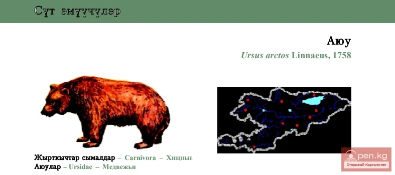 Медведь — Ursus arctos Z.(кыргызча: аю) Кыргызстанда — бул жогорку тоолордун типтүү тургуну. Тоого...