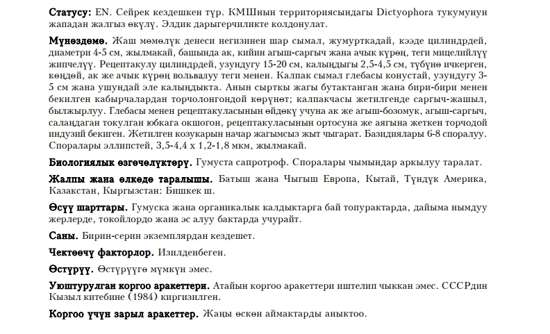 Статус: EN. Сирек түр. СНГ аймагында Dictyophora тукуна кирген жалгыз өкүлү. Элдик медицинада колдонулат.