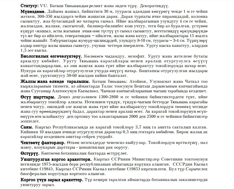 Статус: VU. Батыш Тянь-Шангадагы реликт эндемиги. Декоративдүү.