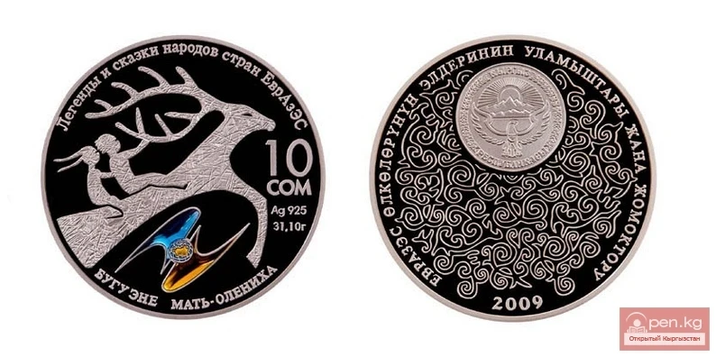 2009-жылдын 29-октябрына карата Кыргыз Республикасынын Улуттук банкы жыйноочу күмүш монета "Эне-олени" 10 сом номиналында "ЕвразЭС өлкөлөрүнүн элдеринин Аңыздар жана жомоктор" сериясына киргизди.