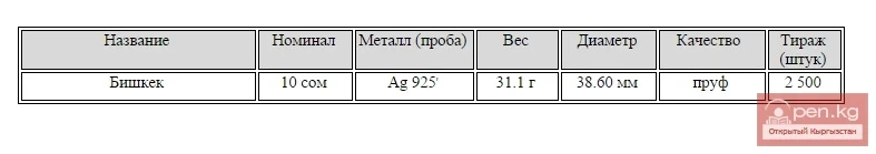 2008-жылдын 18-декабрынан тартып Кыргыз Республикасынын Улуттук банкы жыйынтыктык күмүш монета "Бишкек " сериясы "ЕврАзЭС өлкөлөрүнүн борборлору" номиналы 10 сомду чыгара баштады.