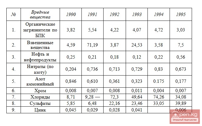 Сууларга эң типтүү зыяндуу заттардын агып чыгышынын динамикасы миң тонна жылына таблицада берилген (Чүй өрөөнү боюнча 1997-жылдагы экология боюнча улуттук отчет)