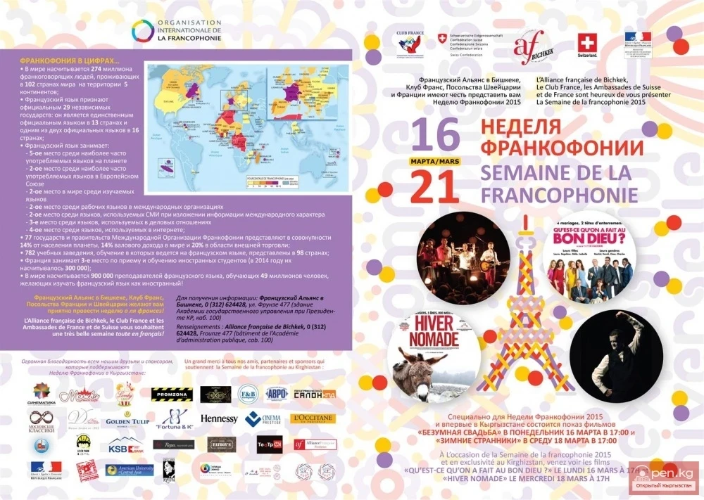 "Француз альянсы" Бишкекте Швейцария жана Франциянын Кыргыз Республикасындагы элчиликтери менен "Клуб Франс" менен биргеликте 2015-жылдын 16-21-март күндөрү Бишкекте франкофония аптасын өткөрүүнү сыймыктанат.