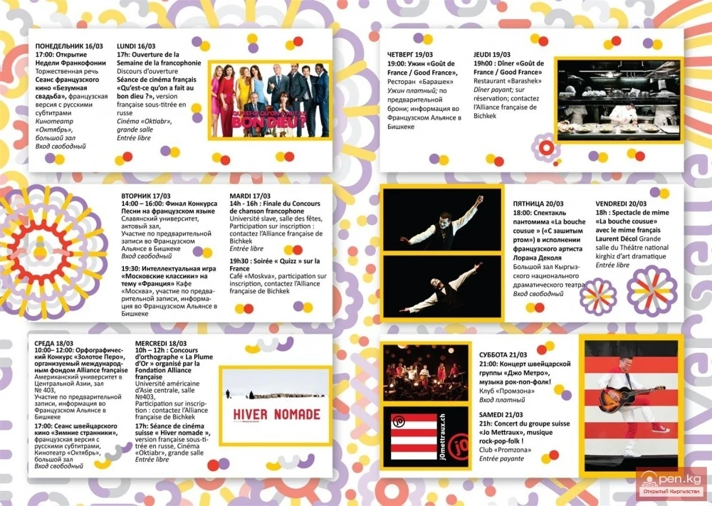 • Швейцария жана француз фильмдери "Октябрь" кинотеатрында көрсөтүлөт: француз комедиясы - 16-мартта саат 17:00дө жана швейцар документалдуу фильми - 18-мартта саат 17:00дө. Эки фильм да француз тилинде, орус субтитрлери менен көрсөтүлөт.