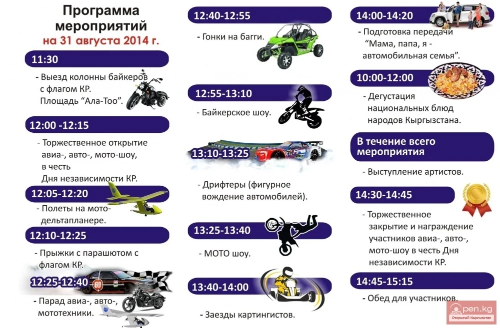 - Биздин фестивалыбыздын өткөрүү күнү бекер эмес тандалган, - деди техно-шоунун уюштуруучүлөрүнүн бири Иван Гелетюк. - Биз башында фестивалыбызды Кыргызстандын көз карандысыздыгынын күнү менен бириктирүүнү пландаштырганбыз. Идея шаардыктарга жана борбордун конокторуна адаттагы майрамга альтернатива көрсөтүүдө. Ар жылы 31-августта адамдар аянтка келишет: сейилдешет, балмуздак жешет, майрамдык концертти угушат, биз болсо көбүрөөк нерсени көрсөтүүнү кааладык. Бишкектиктерге биздин техно-фестивалга катышууну сунуштайбыз. Биринчиден, биз ар кандай техникалык спорт түрлөрү менен алектенген жаштарды бир жерде чогултабыз. Бул байкерлер, мотоциклисттер, картингчилер жана башка көптөгөн адамдар. Бардык каалагандар үчүн, биз Бишкек мэриясы менен сүйлөшүп, конокторду майрам өткөрүлгөн жерге алып баруучу атайын автобус уюштурабыз. Маршрут номери азырынча такталып жатат, бирок ал ЦУМдан чыгып кетет деп белгилүү.