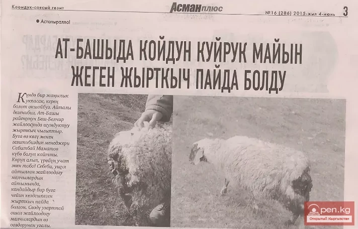 - Мен кой чарбачылыгы менен 1987-жылдан бери, тактап айтканда, отуз жылга жакын алектенем, бирок мындайды эч качан көргөн эмесмин, жырткыч койлорго курдючтук май үчүн кол салганын. Мисалы, карышкыр «мойнуна» койду кесет, же жаныбарды жон терисинен тиштейт. Шакал, ал болсо, дароо терисин кармап, жаныбарды жыртып жиберет. Кээде койлорго барсук да кол салып, жаныбарды ичегисинен жана арткы буттарынан тиштейт. Бирок бул өзгөчө учур. Зарар тарткан койлордо бир да тырмак жок, чупакабра же башка кимдир-бирөө (бул кандай жомок жаныбар?) жаныбарларды гипноздоп, аларды курдюктарын жеп алууга өздөрү сунуштап жатканы сыяктуу. Мындайды бизде тарыхта болгон эмес. Мистика, болгону…