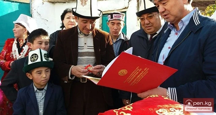 Ошондой эле беш баланын атасы Абдыбаит Жээнбековго президенттин атынан ар бир бала үчүн 50 миң сом берилди. Нарын облусундагы өкмөттүн ыйгарым укуктуу өкүлү Аманбай Кайыпов жаңы төрөлгөн бала үчүн буюмдарды сатып алды.