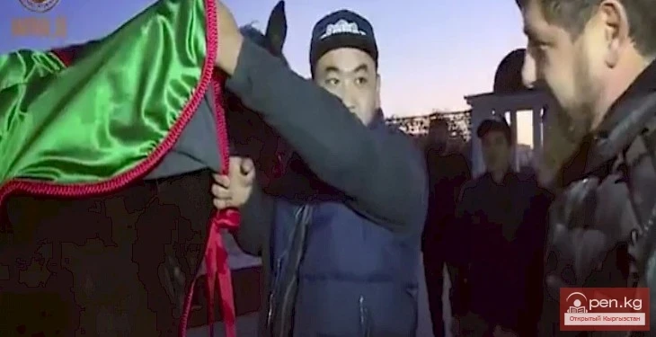"Кыргызстандык жаран Болот Омуралиев мага баа жеткис белек берди. Бул - Кыргызстанда төрөлгөн "американский рысак" породасынан ат. Бирок белек анын тукумдук жана чабыш сапаттарына байланыштуу эмес, менин жүрөгүм үчүн бул ат таза кандуу чабыш аттардан жана Гран-при ээлеринен да кымбат. Болот аттын моюнундагы жараны байкап, Аллахтын атын кайталаган узундукту көрдү. Ал атты мага белек кылууну каалады, ал эми биздин мекендеш Рустам Алиев ташуу боюнча жардам берди. Мен атты чечен элине белек катары чоң ыраазычылык менен кабыл алдым. Чабыш ат үчүн жакшы шарттар түзүлдү, ага тиешелүү кам көрүлөт" - деп бөлүштү Кадыров.