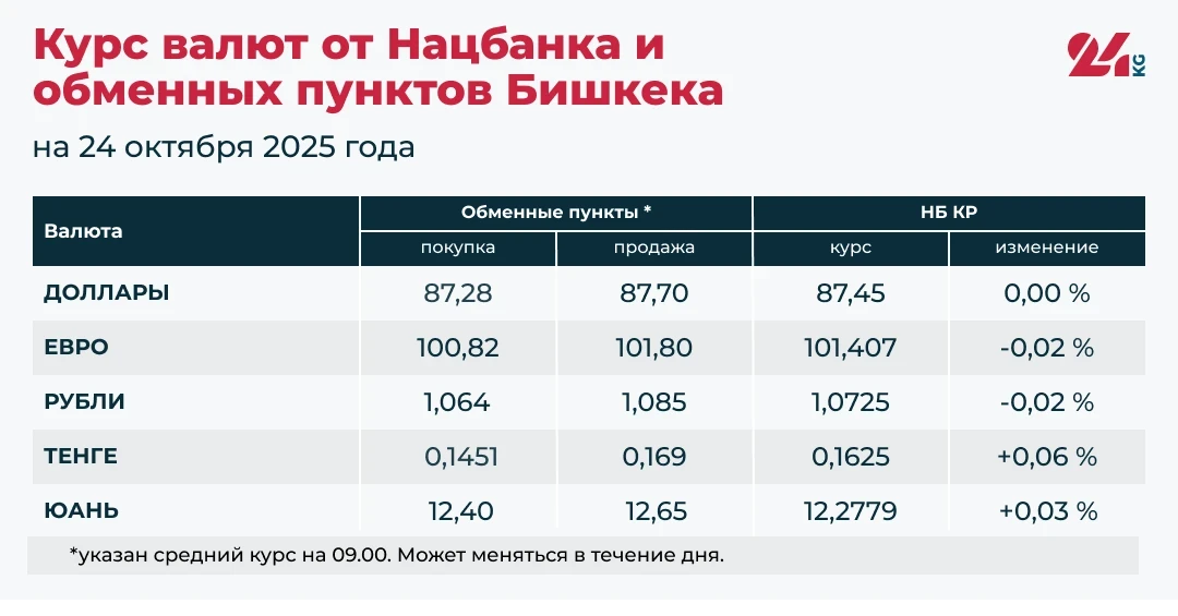 2023-жылдын 24-октябрына карата евро жана рубльдин расмий алмашуу курстары төмөндөп жатат, ал эми казакстандык тенге жана кытай юани өсүүнү көрсөтүүдө. АКШ доллары мурдагы деңгээлде турат. Бул маалымат Кыргызстандын Улуттук банкы жана Бишкектеги алмашуу пункттары тарабынан берилген.