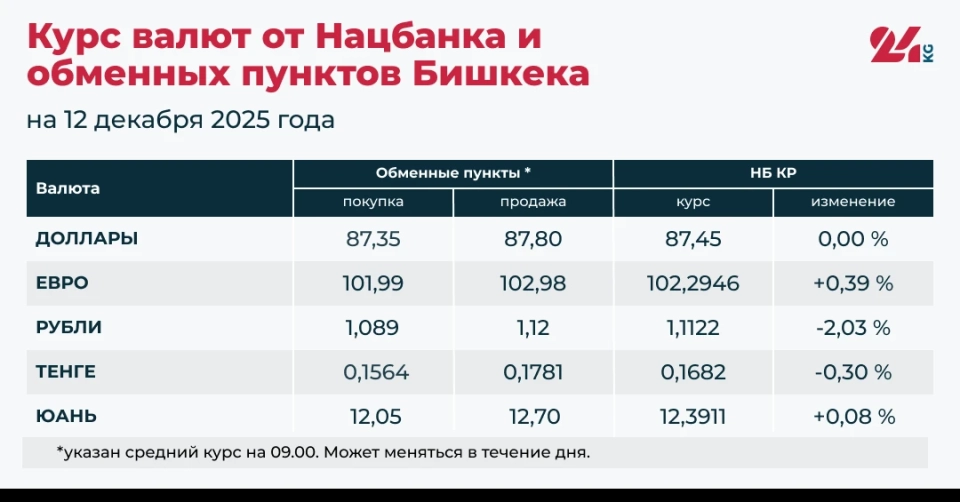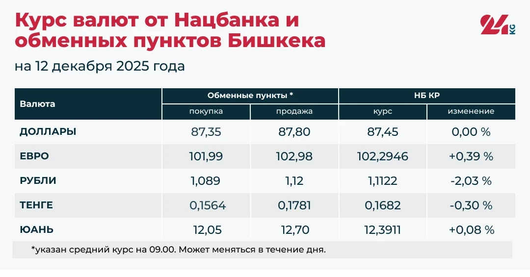 - Алмашуу пункттарындагы орточо курс: сатып алуу — 12,05 сом, сатуу — 12,7 сом.