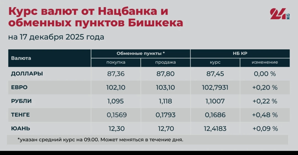 Кыргызстандын Улуттук банкынын жана Бишкектеги алмашуу пункттарынын маалыматына ылайык, евро, орус рубли, казак теңгеси жана китай юанынын курстары өсүүдө. Доллардын курсу туруктуу бойдон калууда.