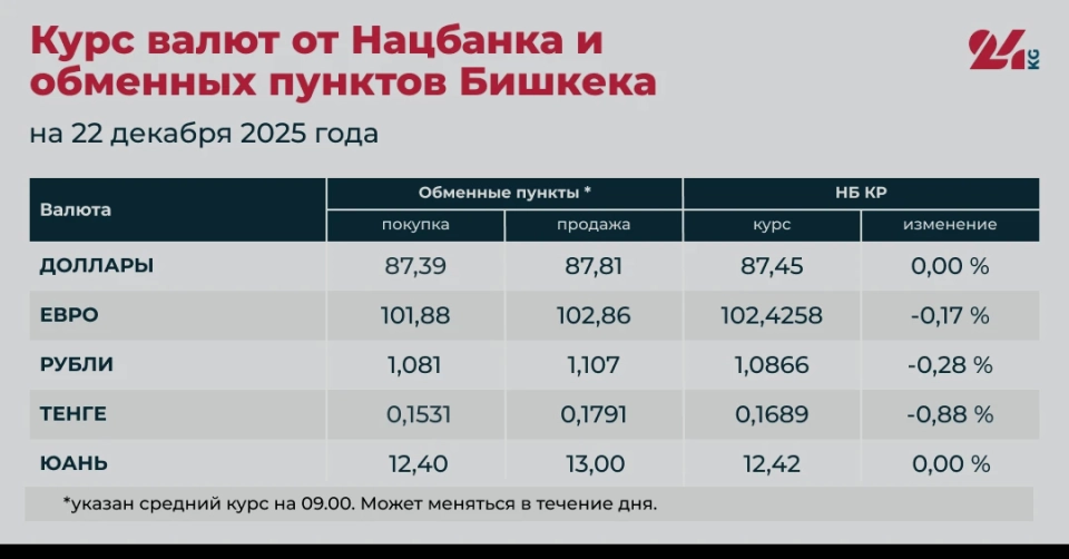- Улуттук банктын курсу: 12,42 сом (өзгөрбөй калды).