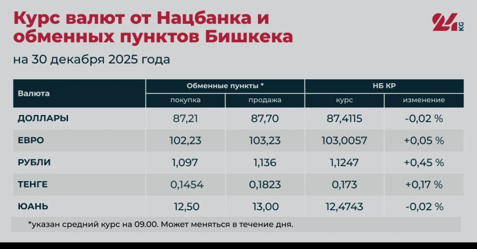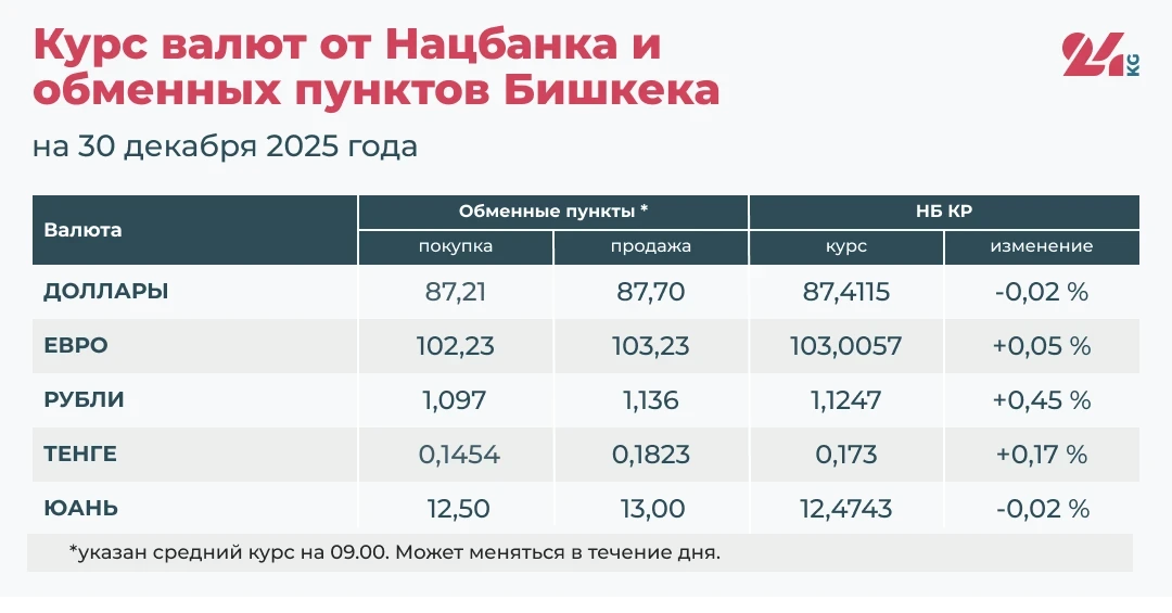 - Улуттук банктын расмий курсу: 1,1247 сом (0,45 пайызга жогорулаш).